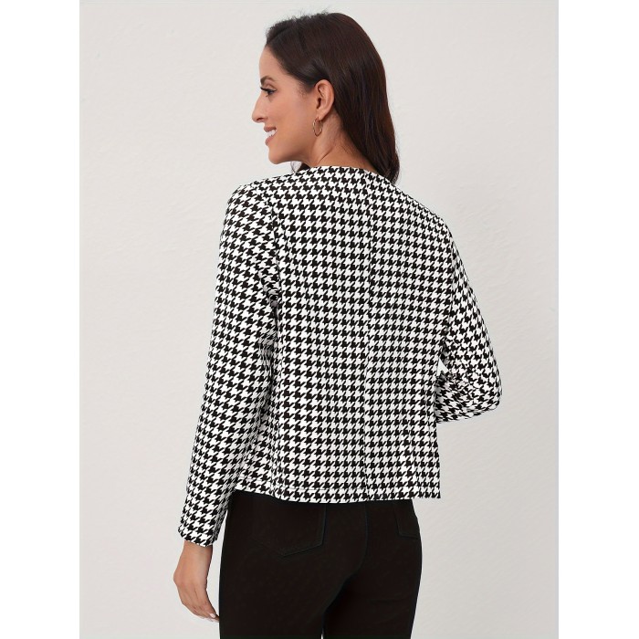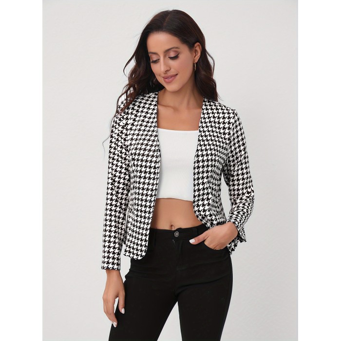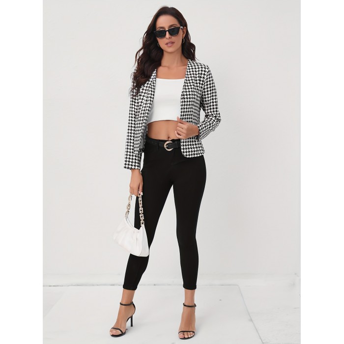 Houndstooth Open Front Blazer, Elegant Long Sleeve Blazer For Office & Work, Women's Clothing