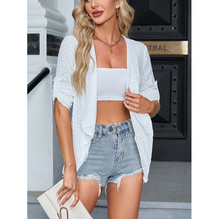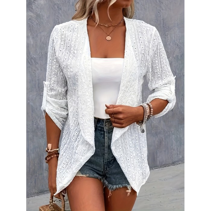 Solid Eyelet Open Front Blazer, Casual Lapel Long Sleeve Outwear For Spring & Fall, Women's Clothing Solid Eyelet Open Front Blazer, Casual Lapel Long Sleeve Outwear For Spring & Fall, Women's Clothing