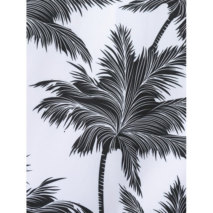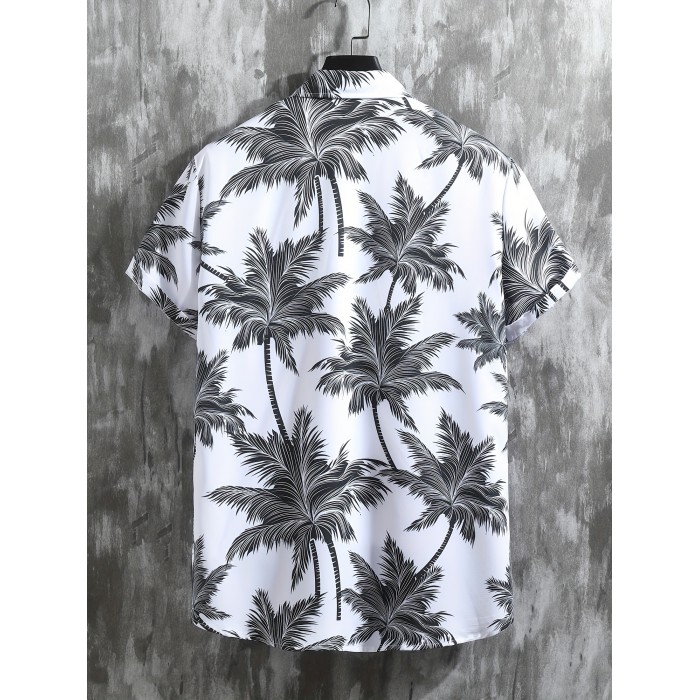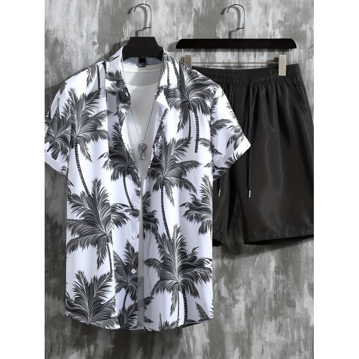 Coconut Palm Print, Men's 2Pcs Outfits, Casual Camp Collar Lapel Button Up Short Sleeve Shirts Hawaii Shirt And Drawstring Shorts Set For Summer, Men's Clothing